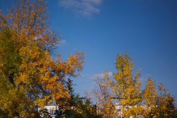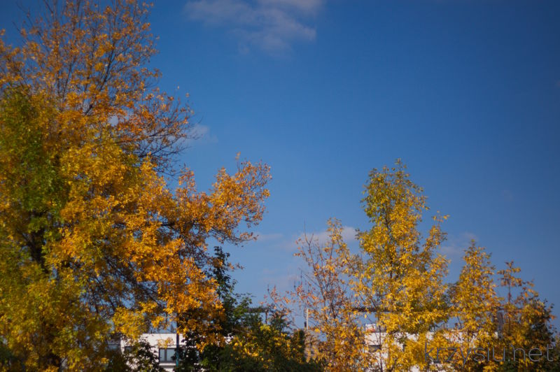 Autumn intensifies! Yellow-oragne-greenish tree leaves lighted by a warm, late sun on the beautiful blue sky. How I wish it could be daily like that. It was 16°C (61°F) here, so quite hot as for such late season.